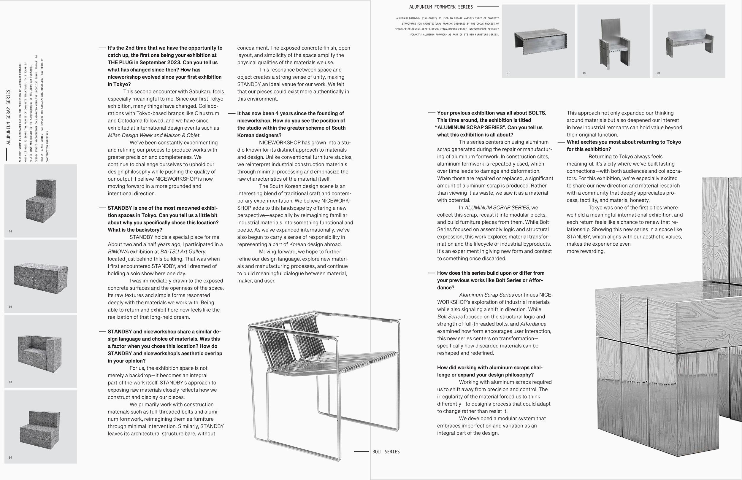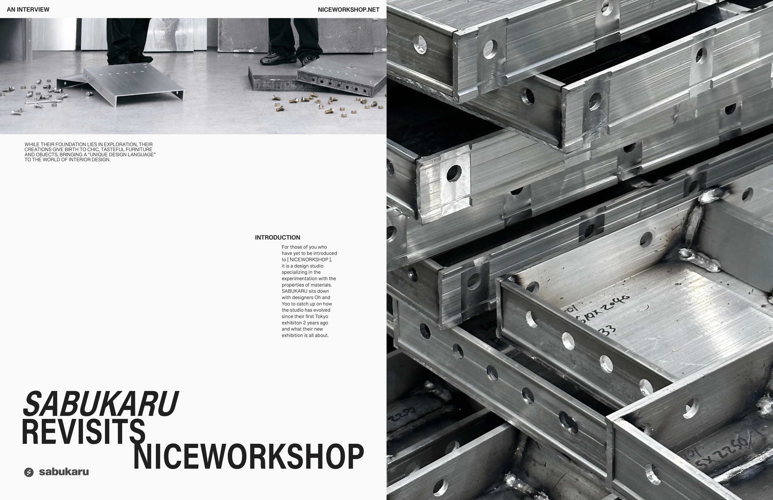Adobe InDesign · class project"SABUKARU REVISITS NICEWORKSHOP"Magazine-style editorial layout of a Sabukaru interview with Niceworkshop.